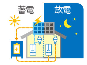 日中は太陽光発電で電力をまかない、余剰電力を蓄電池に貯めておきます。