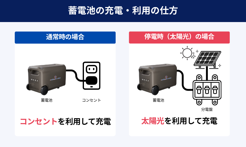 いわば「電気の貯金箱」のような存在で、 停電時や電気代の高い時間帯でも、