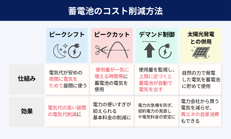 さらに太陽光発電と組み合わせれば、自社で発電した電気をためて効率よく使えるため、電力会社から買う量そのものを減らすことができます。